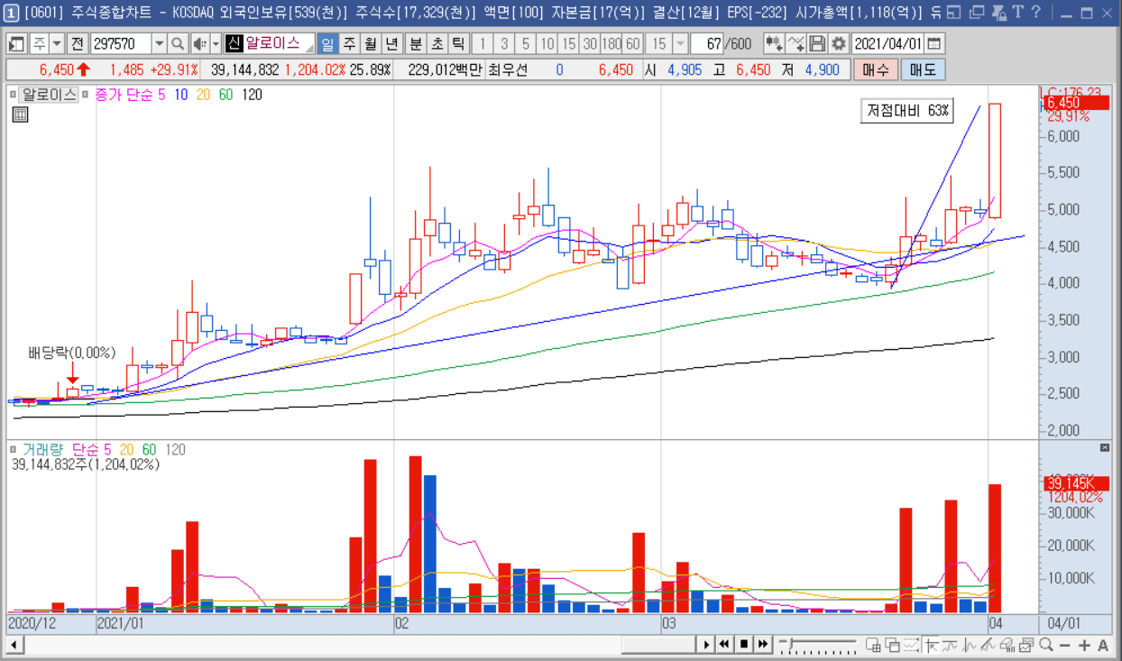 1일 오후 1시 45분 기준 알로이스 주가는 전날보다 29.91% 오른 6,450원 상한가를 기록하고 있습니다.