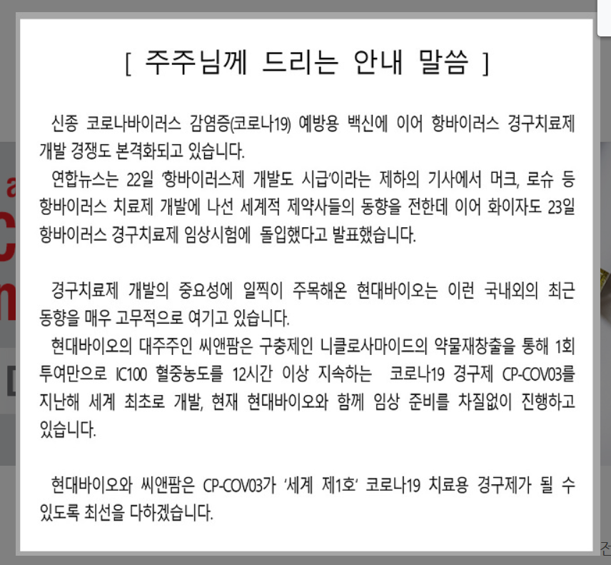 앞서 현대바이오는 대주주인 씨앤팜이 전북대 인수공통전염병연구소에서 실행한 니클로사마이드 기반 코로나19 경구용 치료제 CP-COV03의 항바이러스 효력시험 결과를 홈페이지를 통해 발표습니다.