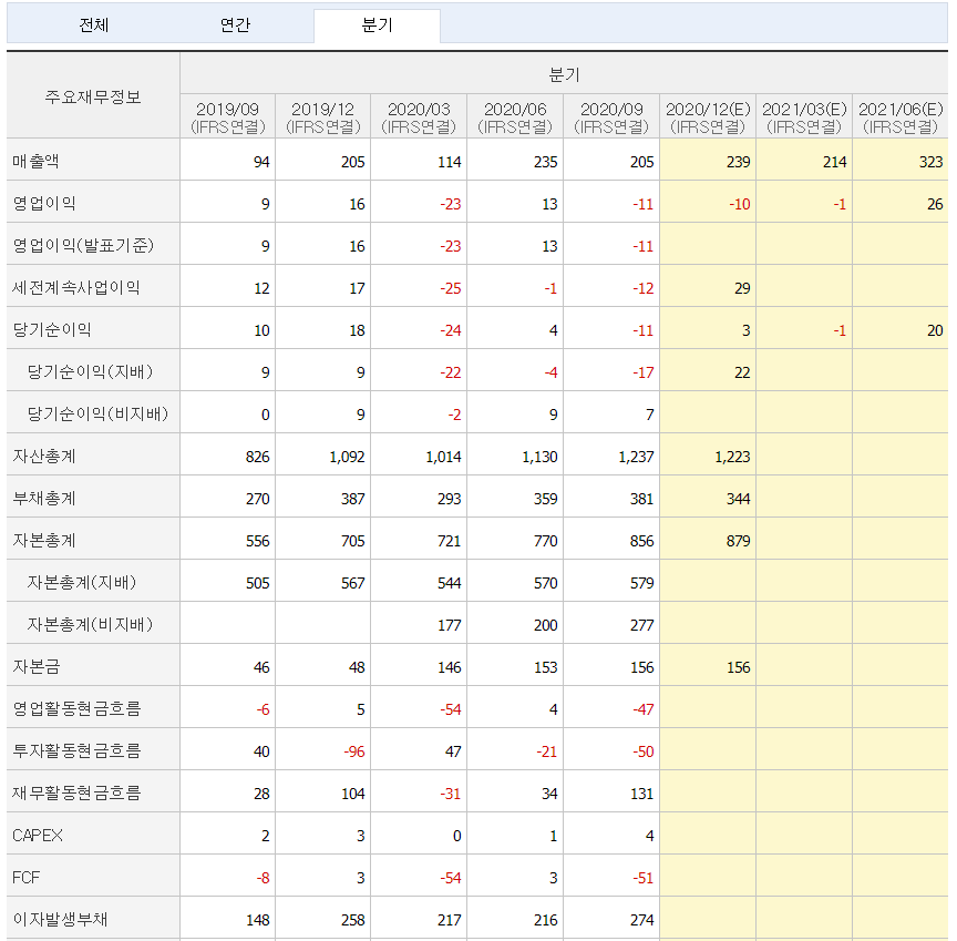 재무재표를 보면 영업이익이 적자이고 앞으로도 적자를 예상하지만, 최근 컴투스가 450억을 투자한다는 뉴스발표 때문인지 시장의 주목을 받았습니다.