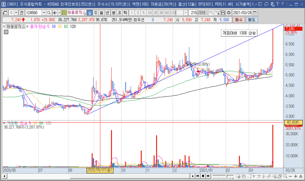 태웅로직스가 오늘 2:45분 29.98% 상승하여 상한가에 진입중이고 7240원을 기록 중입니다.