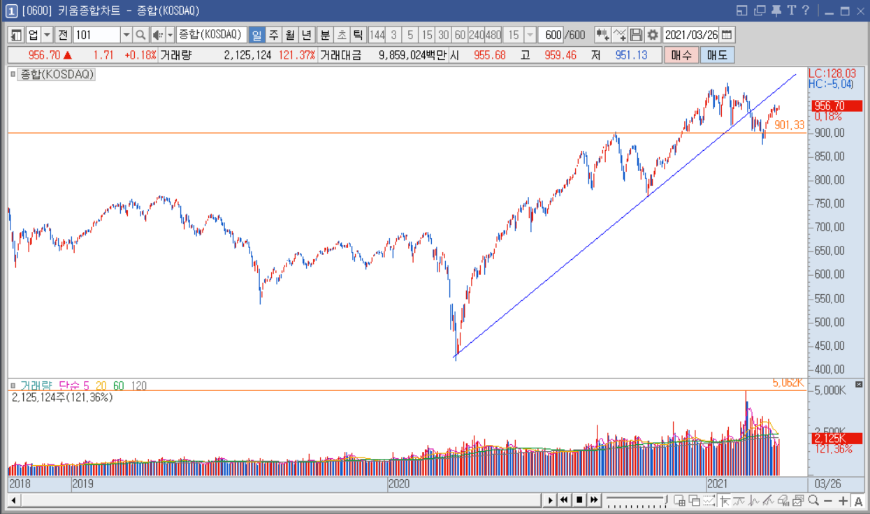 그리고 지금은 코스닥지수가 추세선을 이탈하였지만, 전 고점을 지지하면서 반등이 나온 모습입니다.