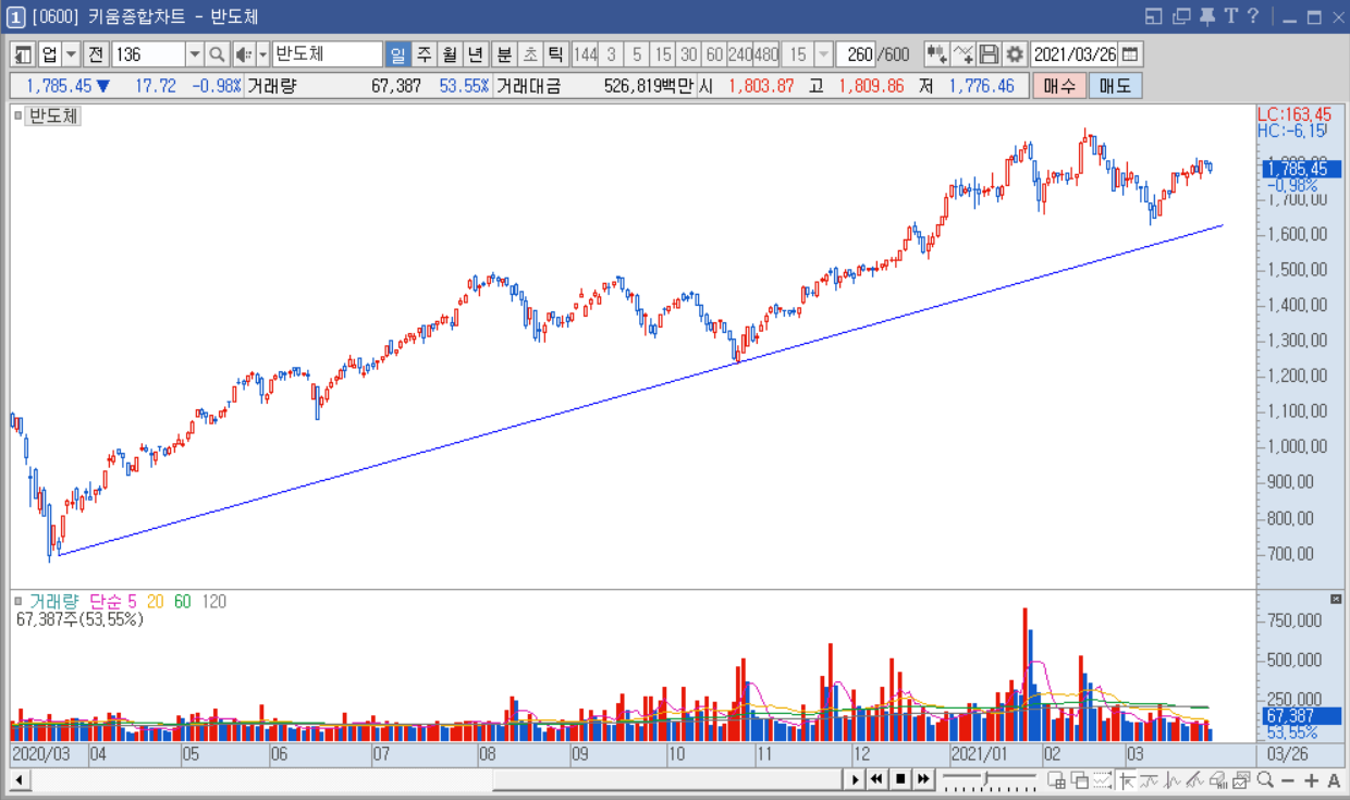 반도체 업종은 상승 추세이지만 단기 고점일 가능성도 있어 보이는 군요.